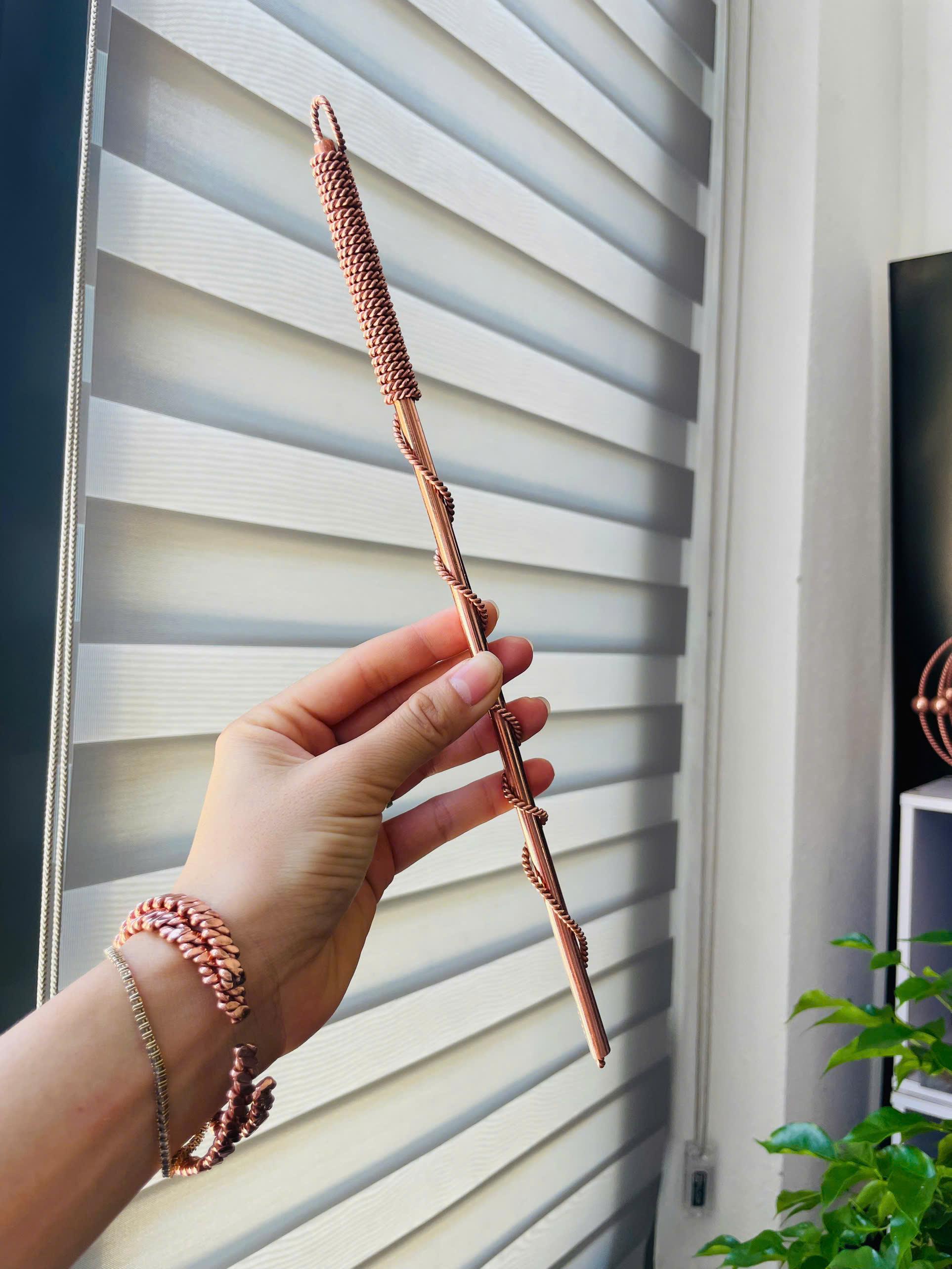 Measuring 20 cm, this wand is made from 99.99% pure red copper, cut, twisted, and assembled with care to maintain its energetic coherence. A trusted tool for meditators, healers, and those working with communication and self-expression such as singers, teachers, and speakers.