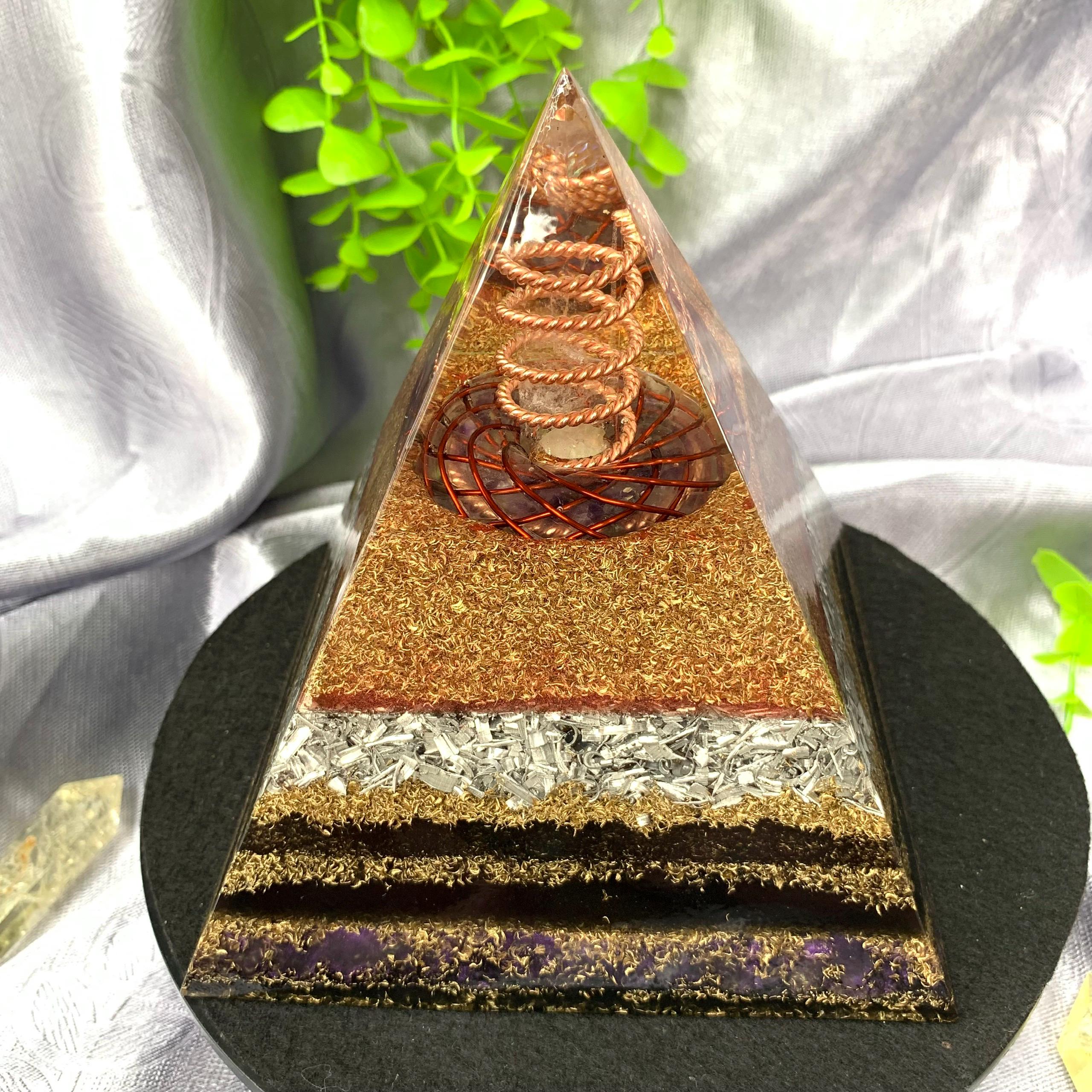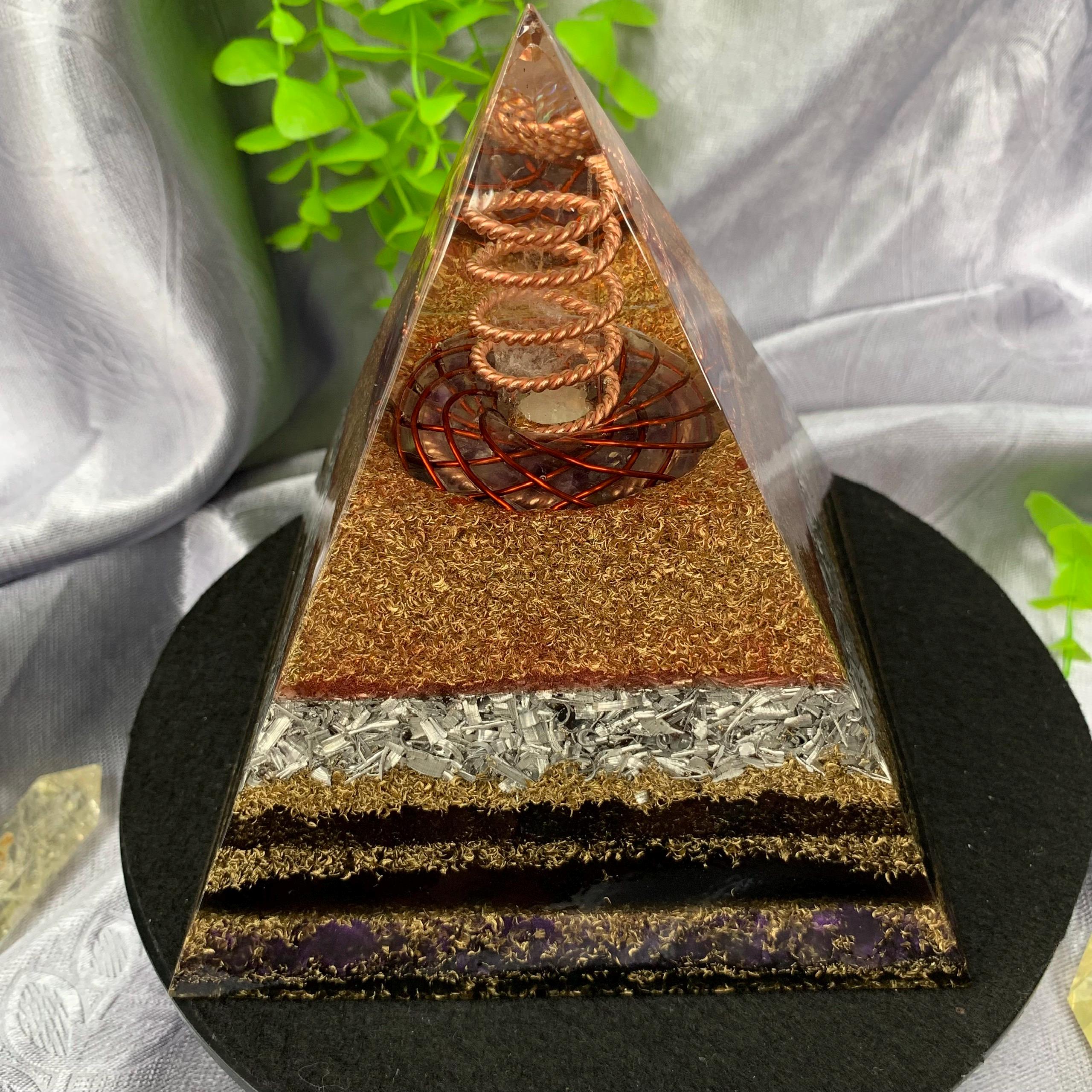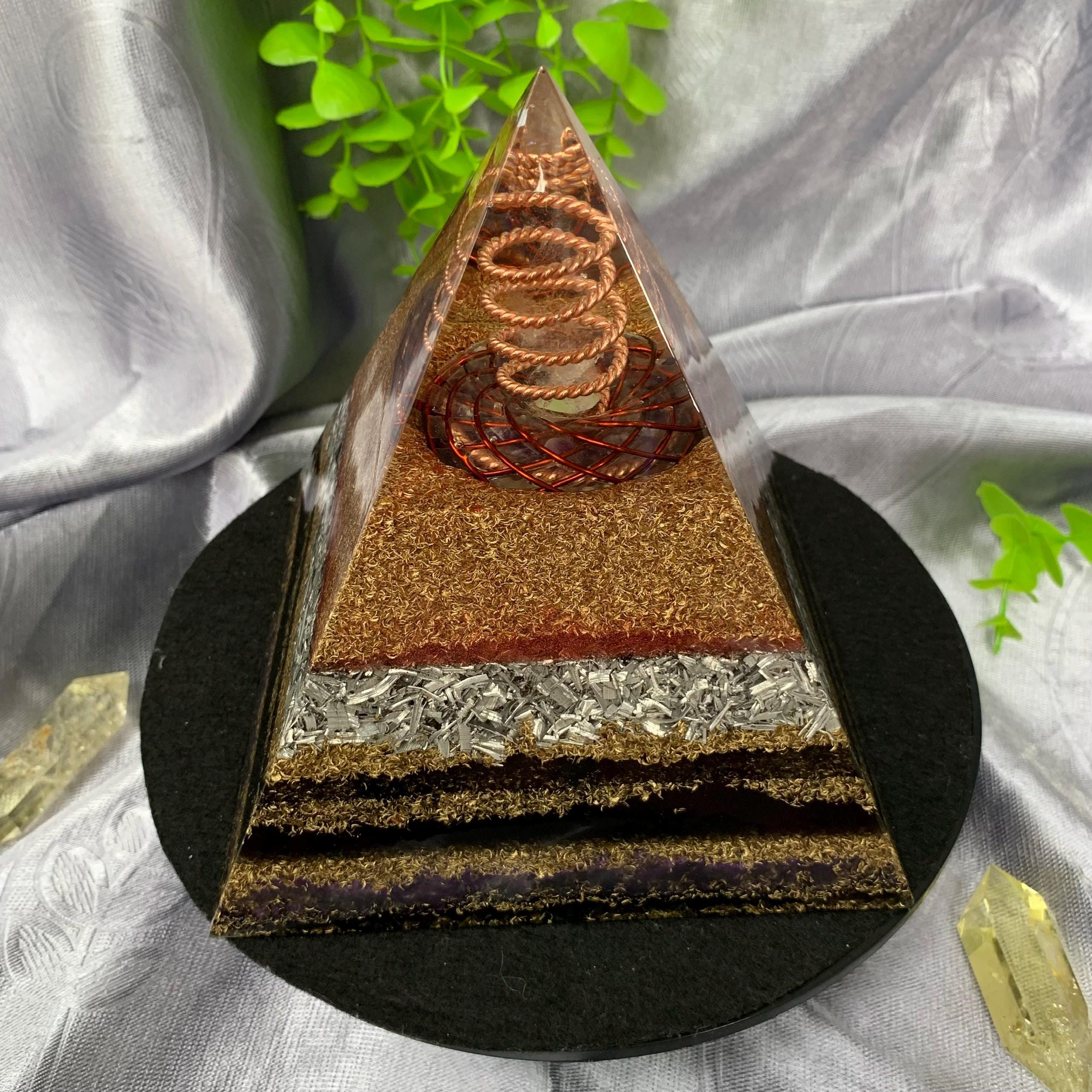 This Orgonite Pyramid is a powerful energy device that combines the principles of sacred geometry with advanced energy technology. At its core lies a Torus Rodin Coil, expertly crafted to create a harmonious toroidal energy field, while a handmade 144 MHz Tensor Ring amplifies and purifies energy for deep healing, protection, and overall energetic balance. A twisted copper coil at the apex surrounds a natural quartz pillar, optimizing and directing the flow of energy throughout the pyramid.